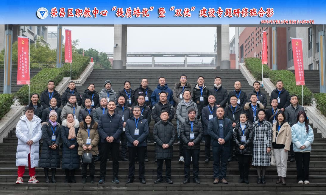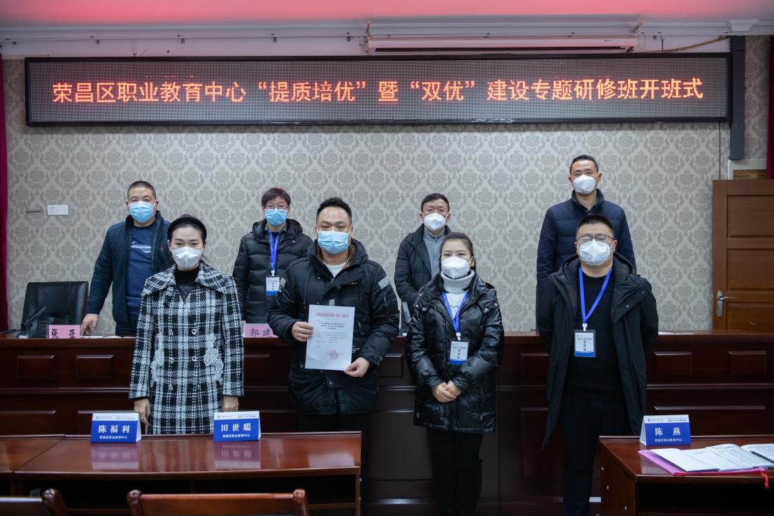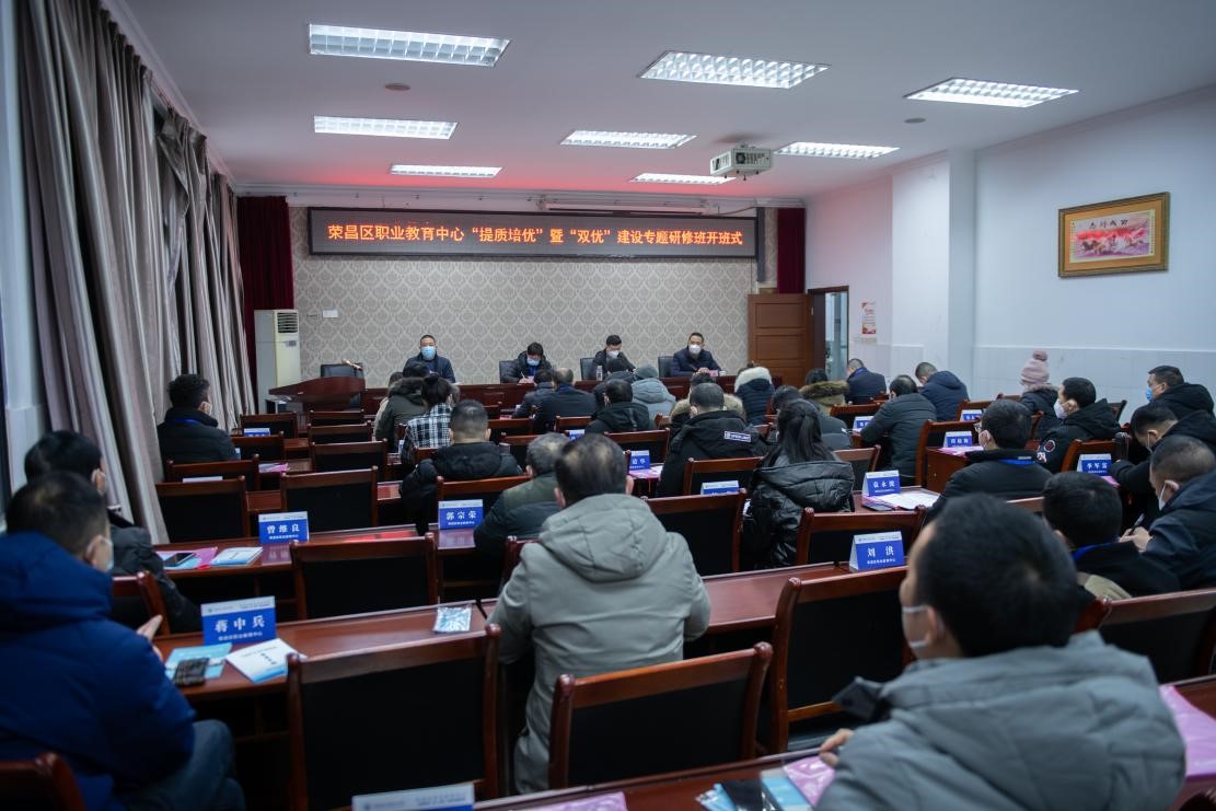 2023年1月3日上午,荣昌区职业教育中心“提质培优”暨“双优”建设专题研修班在我校南校区1-101室举行,荣昌区职业教育中心副校长郭建,我校培训与继续教育学院院长、国培基地办主任莫绍强,培训与继续教育学院综合科科长明伟,以及来自荣昌区职业教育中心近50名学员参加开班式。开班式由国培基地办副主任张亚主持。
