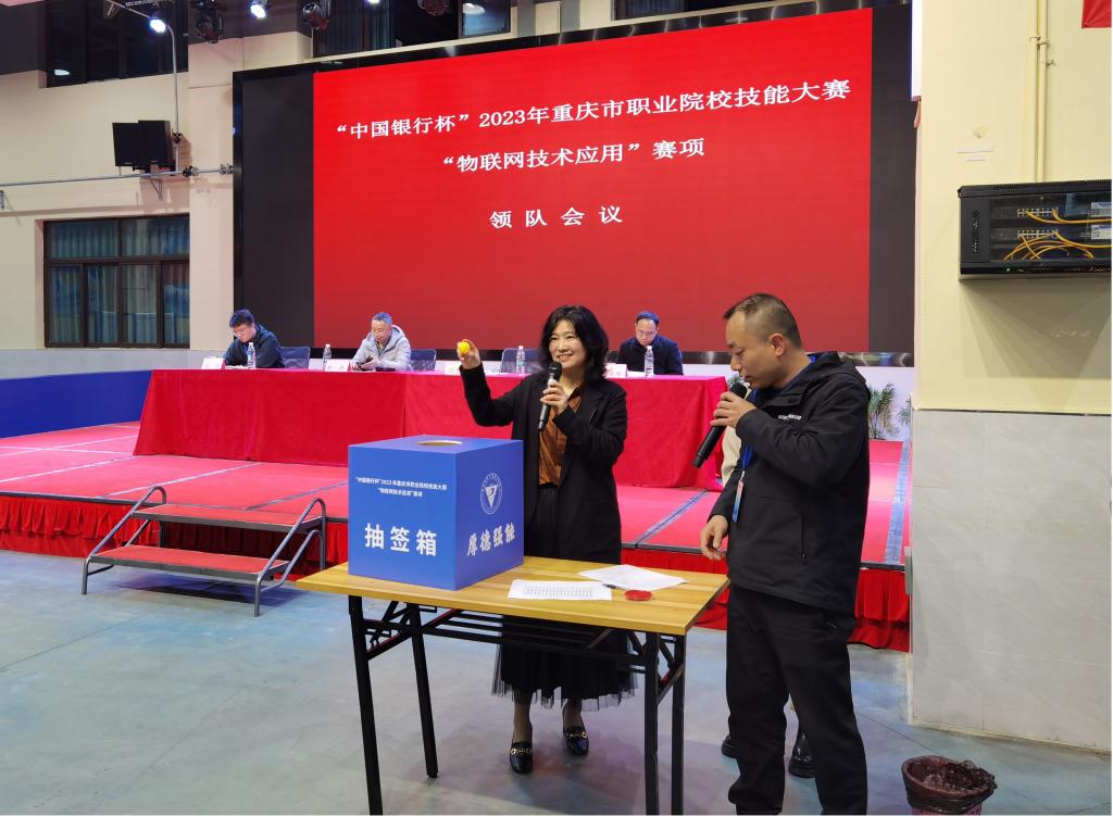 选手报到后,举行了赛前说明会。教科院竞赛办赛项联系人沈雪梅、重庆电子工程职业学院教务处副处长陈进、电子与物联网学院副院长熊德明、现场技术支持单位新大陆时代科技有限公司技术负责人冯剑出席会议。会议由沈雪梅主持,陈进致辞并介绍了竞赛准备情况,冯剑针对竞赛设备技术、注意事项等进行了说明。现场还进行了专家技术答疑、比赛场次抽签、场地参观等环节。最后,抽取3名领队作为本次赛项仲裁监督小组成员,参与比赛全过程督导及赛项仲裁。