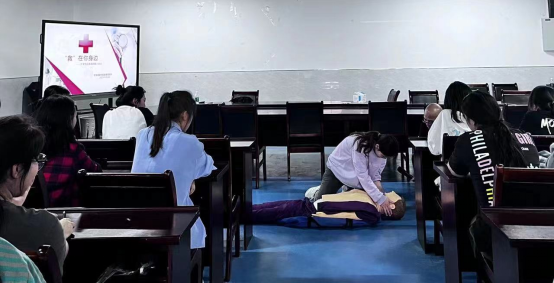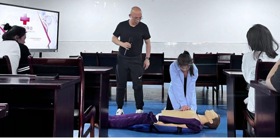 培训中费主任通过理论与实践相结合的方式,对急救基本知识、常见急救处理方式等应急救护知识进行讲解,并重点对“心肺复苏术”、海姆立克急救法的实践要领进行了详细的分布着讲解和示范指导。