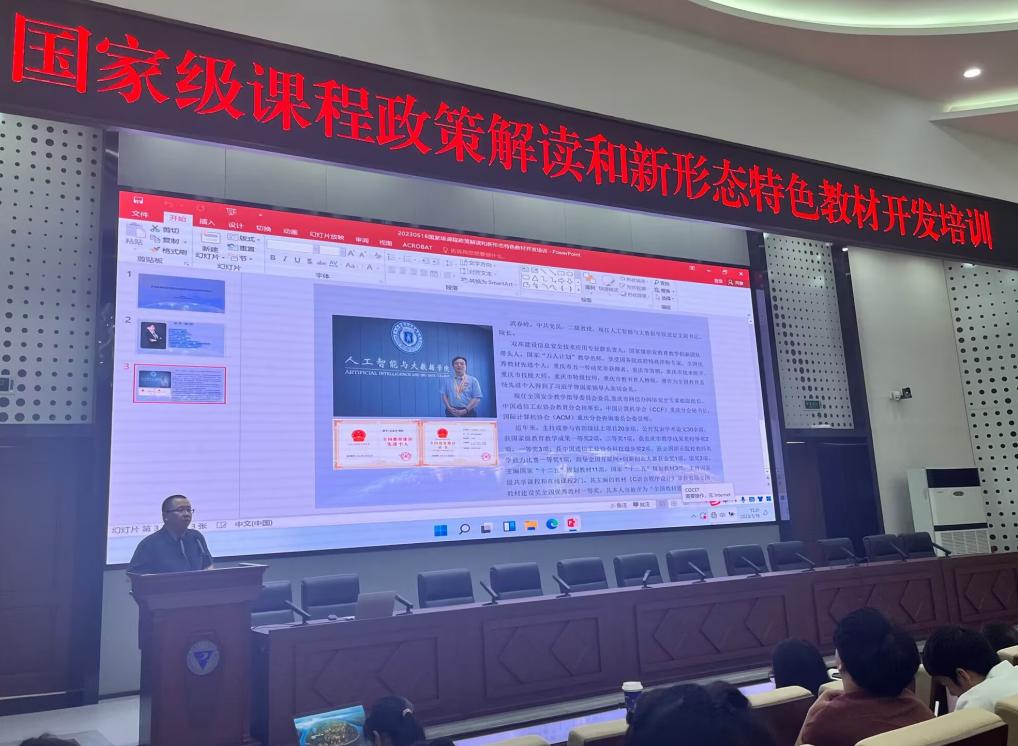 本次培训由教务处教学保障科负责人陈学昌主持。教务处邀请国家级课程思政教学名师和教学团队负责人、电子与物联网学院彭华教授做了题为《国家级课程政策解读》的报告;全国优秀教材一等奖和全国教材建设先进个人获得者,国家级职业教育教学创新团队带头人、享受国务院特殊津贴专家,国家“万人计划”教学名师,人工智能与大数据学院院长武春岭教授做了题为《职业教育新形态特色教材开发模式创新与实践解读》的报告。