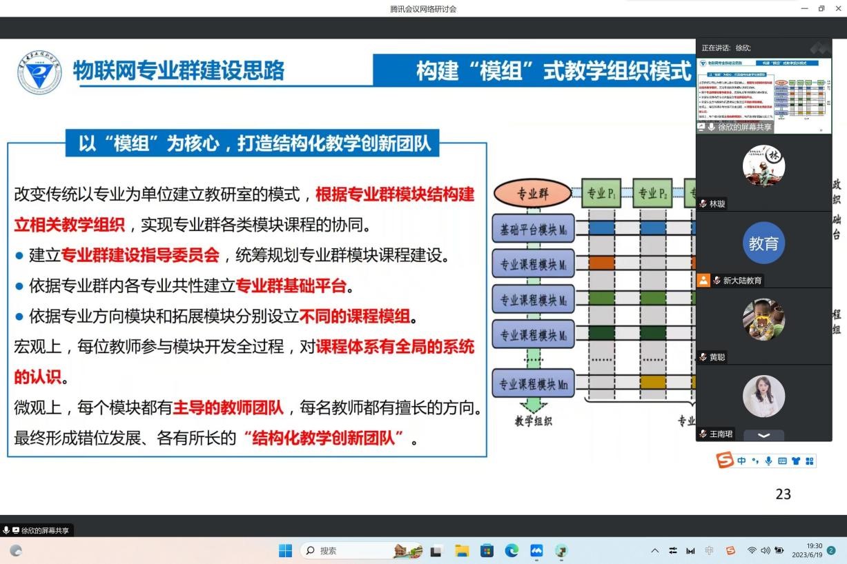 2022年6月19日至20日,由我校与北京新大陆时代科技有限公司主办、机械工业出版社有限公司协办的物联网工程实施与运维系列教材发布会顺利召开。会上,我校电子与物联网学院徐欣教授介绍了物联网专业的建设经验,详细分享了以“模组”为核心,打造结构化教学创新团队的建设思路,提出改变传统以专业为单位建立教研室的模式,依据专业群模块结构建立相关教学组织的方式。