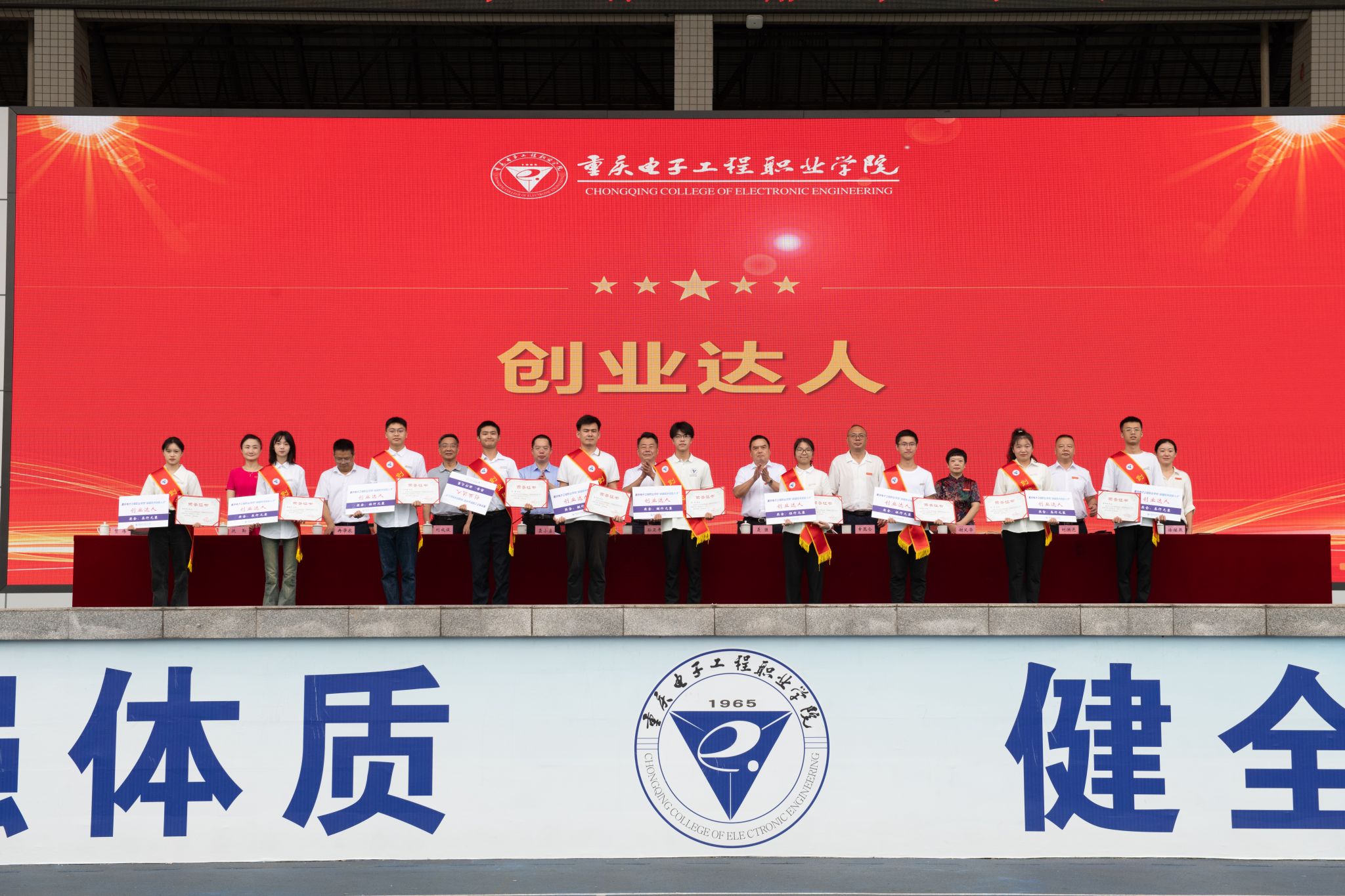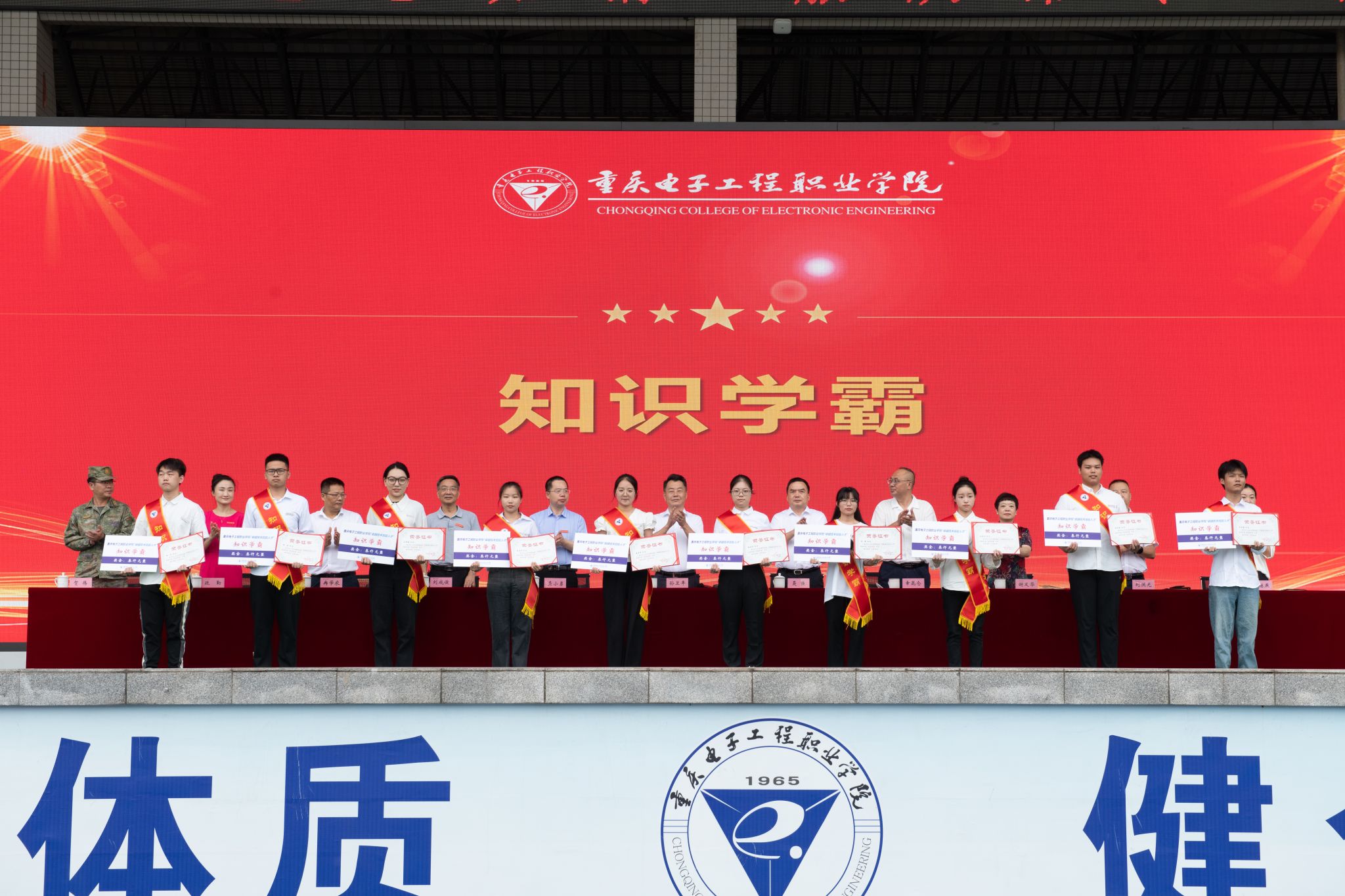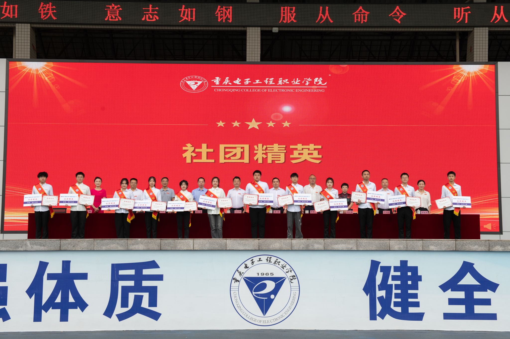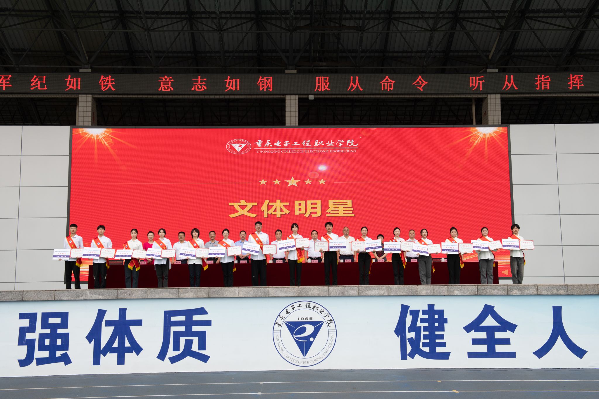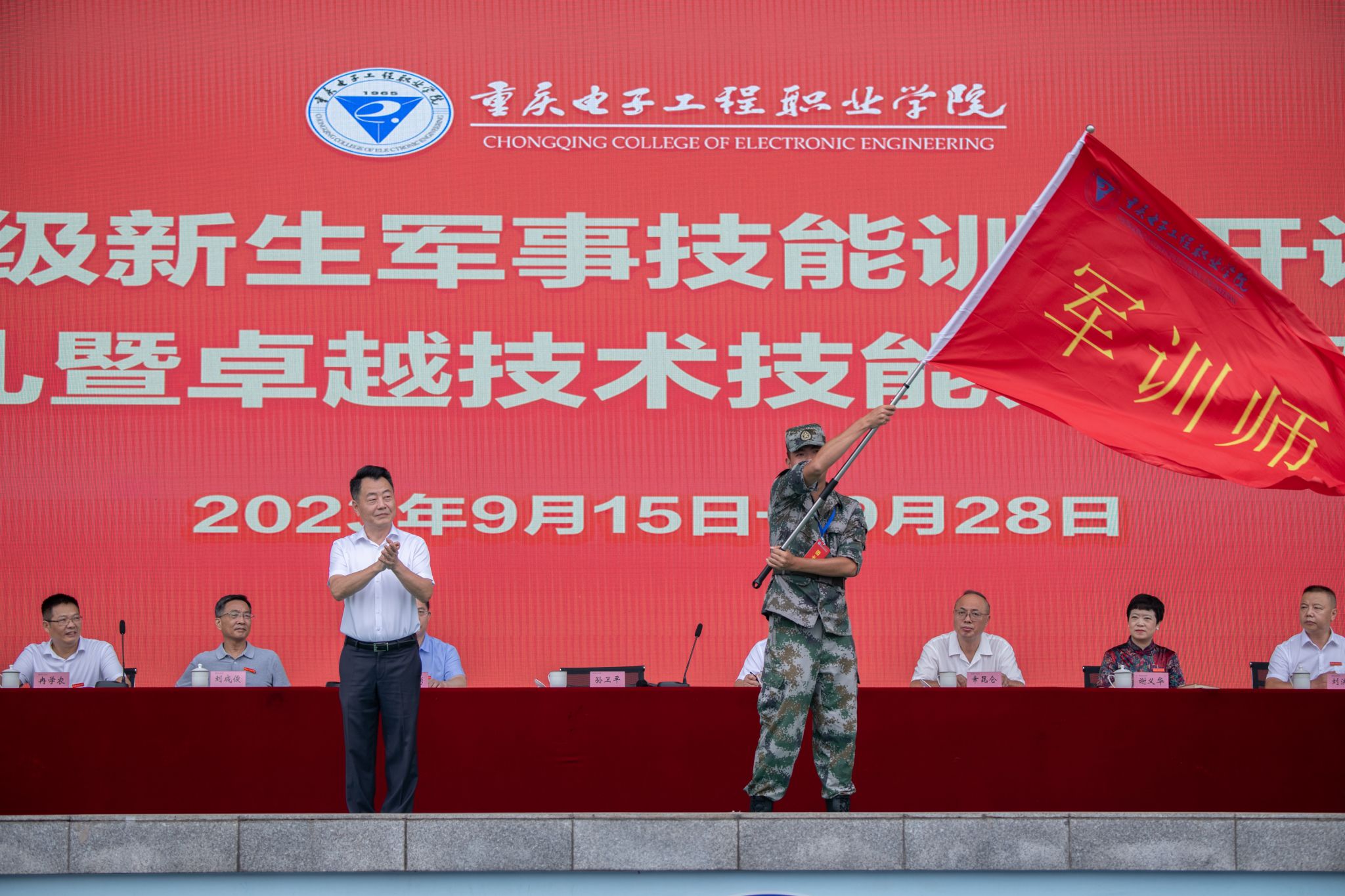 2023年9月18日上午,我校2023级军事技能训练开训仪式、开学典礼暨“卓越技术技能人才”颁奖典礼在重电奕晖运动场举行。学校全体校领导,中国人民解放军重庆市沙坪坝区人民武装部领导及官兵,各职能部门负责人及二级学院书记、院长、学管科长、新生辅导员,重庆电子工程职业学院2023级新生参加了典礼活动。大会由党委副书记龚小勇主持。