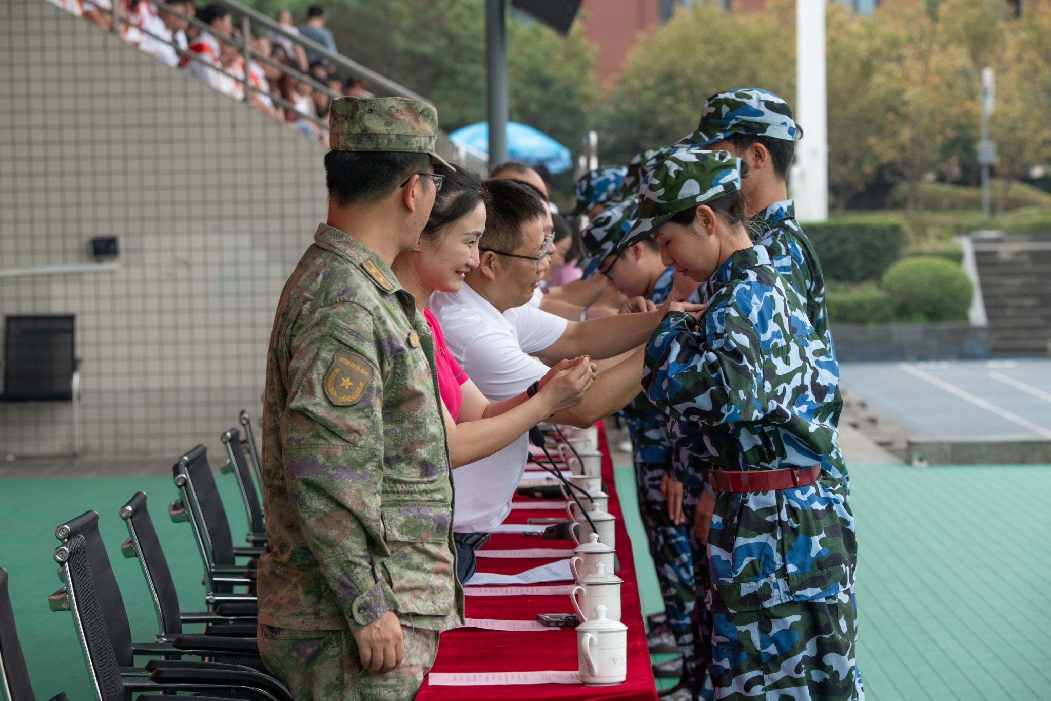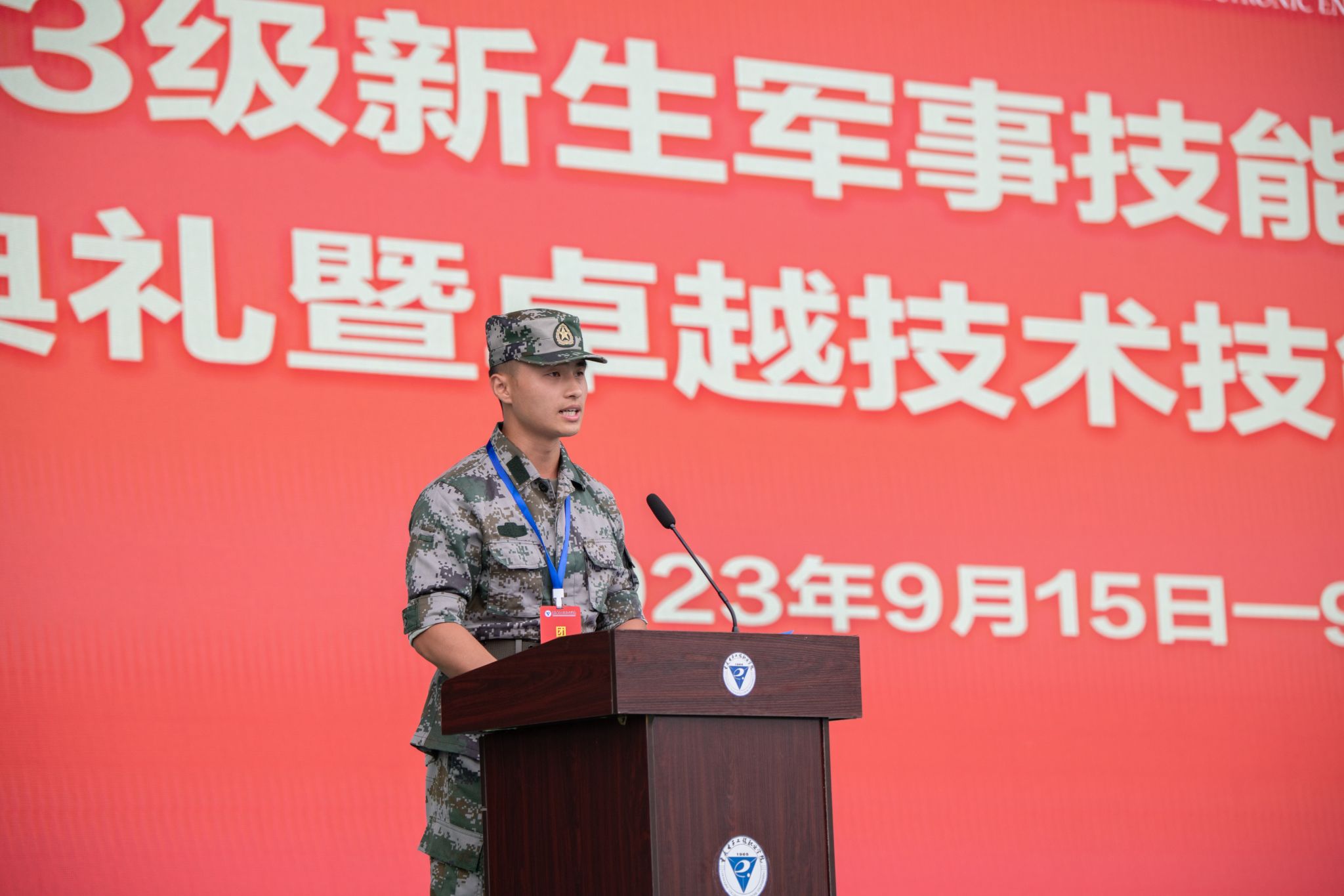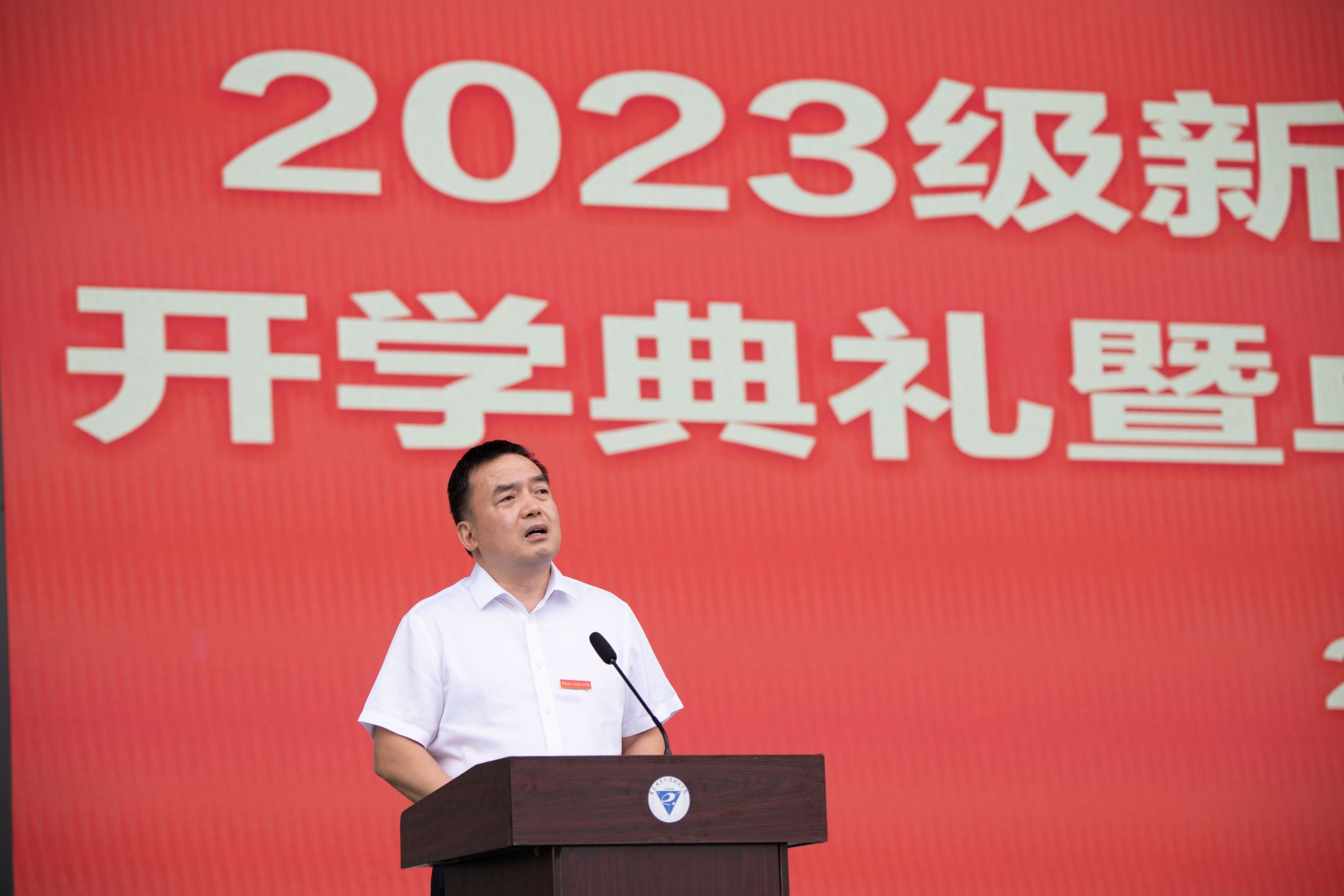 为增强2023级学生的集体荣誉感和归属感,在本次开训仪式暨开学典礼中,由主席台全体校领导为2023级新生代表佩戴校徽。