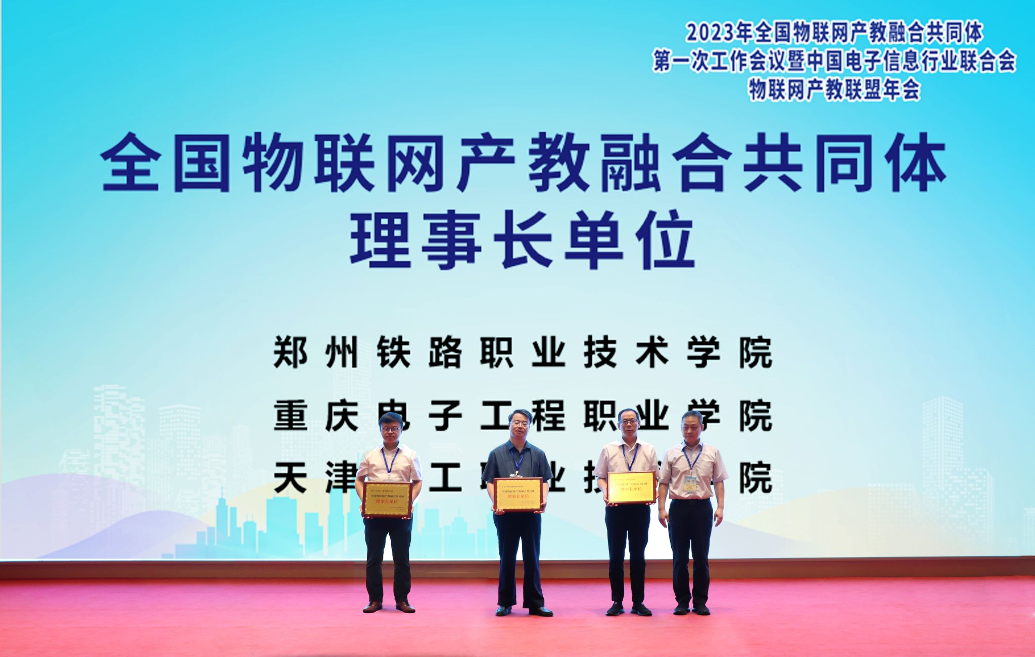 9月20日,2023年全国物联网产教融合共同体第一次工作会议暨中国电子信息行业联合会物联网产教联盟年会在福州召开。本次会议由全国物联网产教融合共同体、中国电子信息行业联合会物联网产教联盟及新大陆科技集团有限公司主办。重庆电子工程职业学院当选全国物联网产教融合共同体理事长单位,并牵头校企合作典型生产实践项目建设工作组,电子与物联网学院院长陈良代表学校接受授牌。