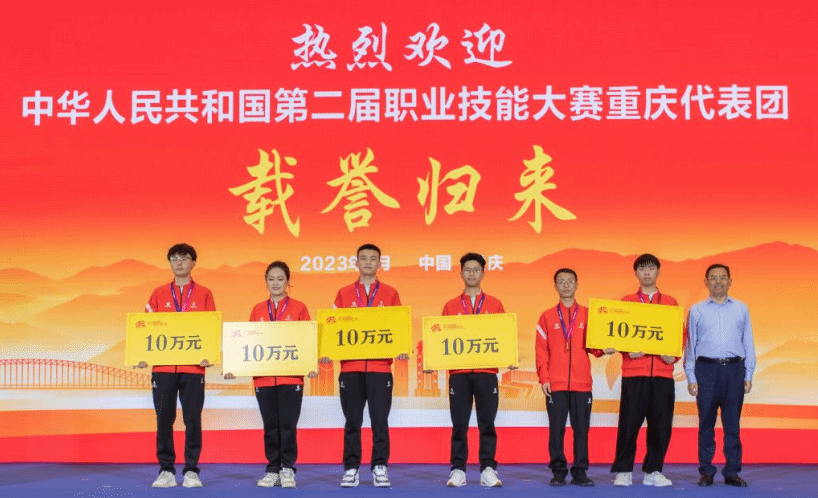 重庆市人力资源与社会保障局领导在祝贺重庆代表团载誉归来的同时,特别提出表扬了我校近年在世界技能大赛和中华人民共和国职业技能大赛中取得的优异成绩:在2020年中华人民共和国第一届职业技能大赛荣获一金一银,2022年世界技能大赛特别赛荣获金牌,本次中华人民共和国第二届职业技能大赛又荣获两金,充分肯定了我校在为重庆市区域人才培养上做成的巨大贡献和取得的突出成绩。大会现场,重庆市人力资源与社会保障局领导还为获奖选手颁发了现金奖励。