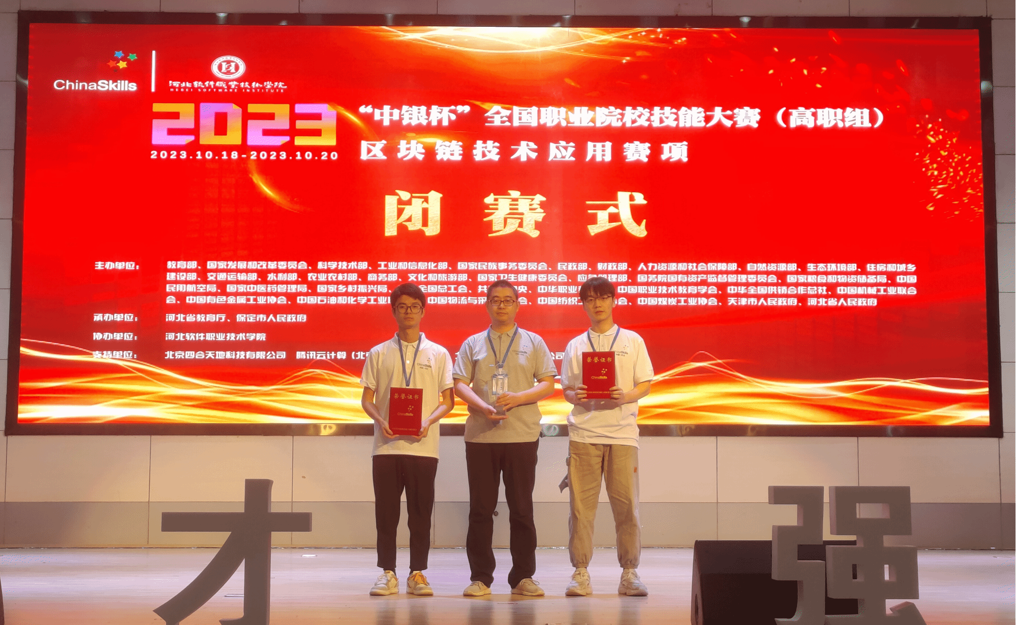 10月19日至20日,2023年全国职业院校技能大赛“区块链技术应用”赛项(高职组)在河北软件职业技术学院举行,来自全国各省、直辖市、自治区的77支队伍同台竞技,我校人工智能与大数据学院路亚、李腾两位老师指导的向键雄、杜小敏两位同学,获得团体一等奖。