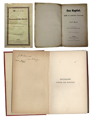 左上图为1848年《共产党宣言》德文第一版。右上图为1867年《资本论》德文第1卷第一版。下图为恩格斯的题字赠书《社会主义从空想到科学的发展》,1892年英文版。